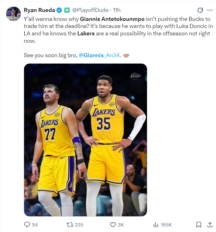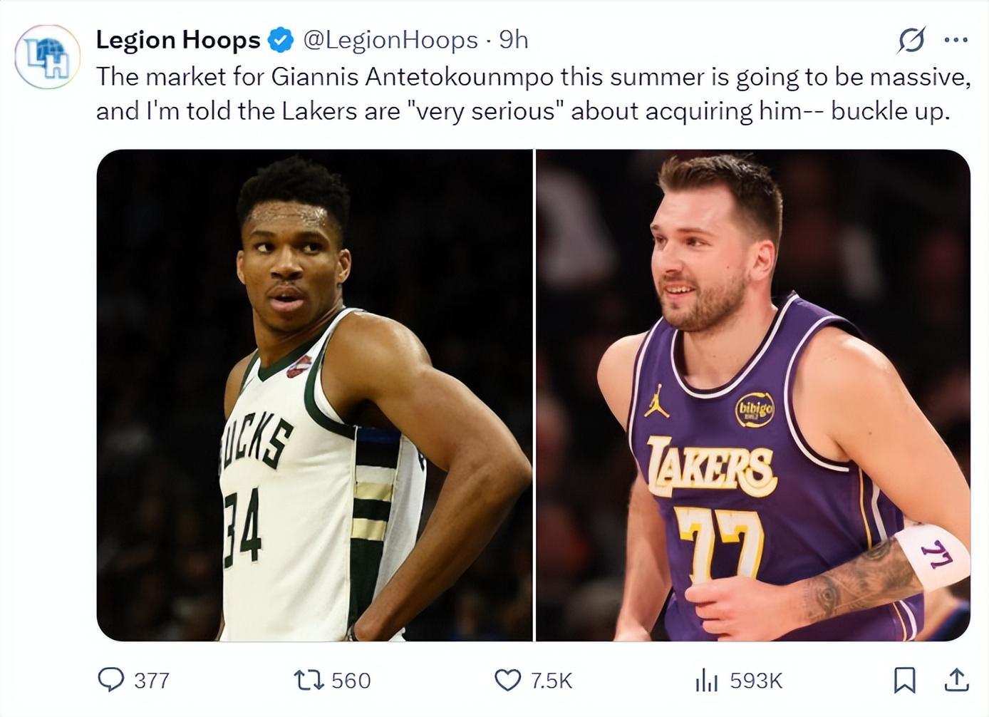 根据湖人记者Ryan Rueda的说法,雄鹿队没有在交易截止日前送扬尼斯的原因之一就是,字母哥希望在今夏与东契奇并肩作战,而且他知道湖人在休赛期开出的筹码会比交易截止日更好,也能帮助雄鹿队。